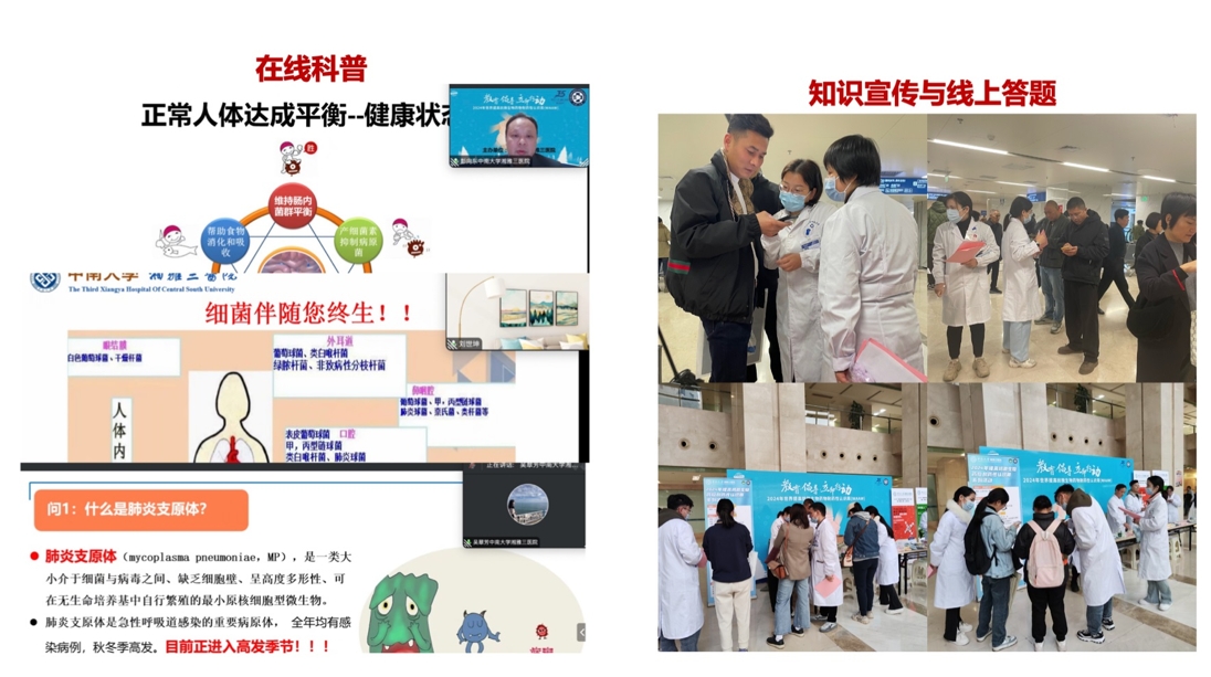 11月18~24日是世界第十个“提高抗微生物药物耐药性认识周”,湘雅三医院药学部联合医务部、医院感染控制中心、门诊部以及抗菌药物科学化管理(AMS)小组成功举办“2024年世界提高抗微生物药物耐药性认识周”系列活动。2024年的“提高抗微生物药物耐药性认识周”主题是“教育、倡导、立即行动”。此次活动旨在提高全社会合理使用抗微生物药物的意识和水平,遏制细菌耐药发展与蔓延,维护人民群众身体健康,促进经济社会协调发展。