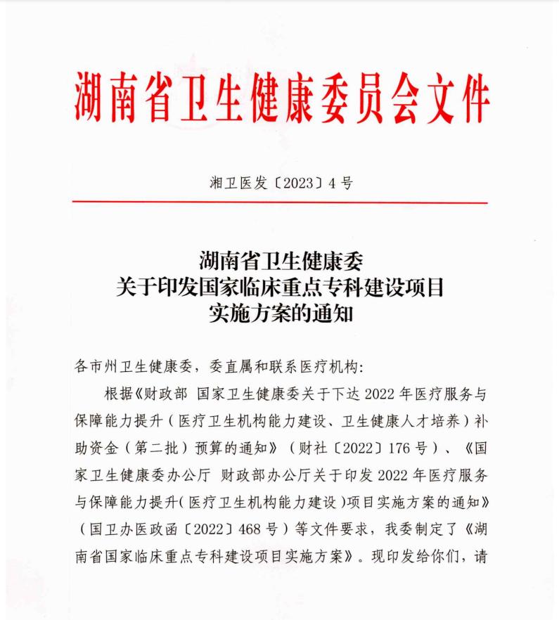 近日,湖南省卫生健康委下发了《关于印发国家临床重点专科建设项目实施方案的通知》《关于印发国家临床重点专科建设项目和培育项目评估工作方案的通知》,中南大学湘雅三医院再获5个国家临床重点专科项目。其中,麻醉科、血液内科成功获批国家临床重点专科建设项目,肾内科、儿科和呼吸与危重症医学科获批湖南省国家临床重点专科培育项目。