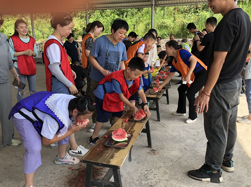 最令人期待与开心的是吃西瓜比赛了。孩子们知道活动安排中有吃西瓜比赛,早早在家练习“吃功”,誓要在赛场上一展风采。正值本地西瓜成熟季节,作为消暑利器,也是味美之时。此次吃西瓜比赛采用果园自产西瓜,以接力赛的形式,分成家庭三人组、家庭两人组、同事组几种比赛组合。虽是比赛,吃相仍有不同,有豪爽粗犷型,有中规中矩型,有优雅矜持型。比赛心态也是各不相似,有重在参与型,1岁多的宝宝乐在其中;有赛出水平型,那个苦练“吃功”的孩子,速度、技巧及吃相也是收获了大家的掌声与笑声。经过几番角逐,大家在一片欢声笑语中享受着美味与快乐。有孩子妈妈笑称自己的孩子“只怕这个星期都不会要吃西瓜了!”