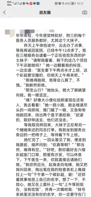 12月9日,胡先生按约到湘雅三医院健康管理中心参加职工体检,途中处理一些事情耽误了时间,再赶到已12点40,早已过了下班时间。看到还在加班整理表格的护士彭芙蓉,他赶忙上前询问,彭芙蓉不但热情接待了他,积极帮他想办法,更是在知道他准备继续空腹等下午再做空腹彩超时,急他所急,有始有终地协调处理,让他如沐春风,在朋友圈写下了当天的情况: