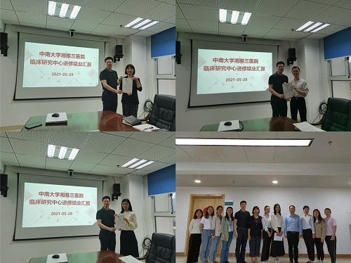 5月28日,临床试验研究中心召开了2021年湘雅三医院首批临床试验进修学员结业汇报。湖南省药品监督管理局2021年3月下发了《关于加强药物临床试验机构管理与开展2021年度药物临床试验机构监督检查的通知》(湘药监函〔2021〕23号),中南大学湘雅三医院正式成为湖南省首批新备案机构药物临床试验培训基地。为能够让学员在培训期间尽快熟悉和掌握临床试验的知识和技能,临床试验研究中心和毕业后医学教育办公室共同制定并对外发布了临床试验进修学员招生和培养方案。