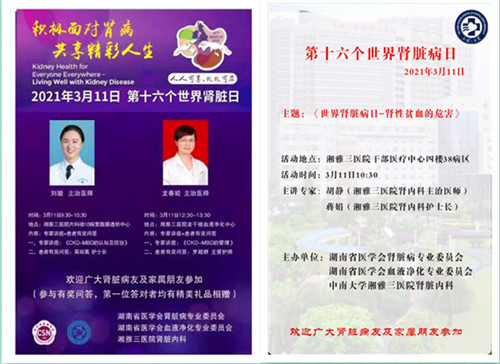 今年的主题是“与肾病共存,共享精彩人生”(Living Well with Kidney Disease)。易斌副主任,刘骏、胡静、龙春姣医生,罗超群、李啟护士等用生动的公益授课以及肾友会的形式,面对面与肾友们交流怎样保护肾脏、关爱肾脏以及如何积极面对肾病,学会跟肾病和平共处,共享精彩人生。