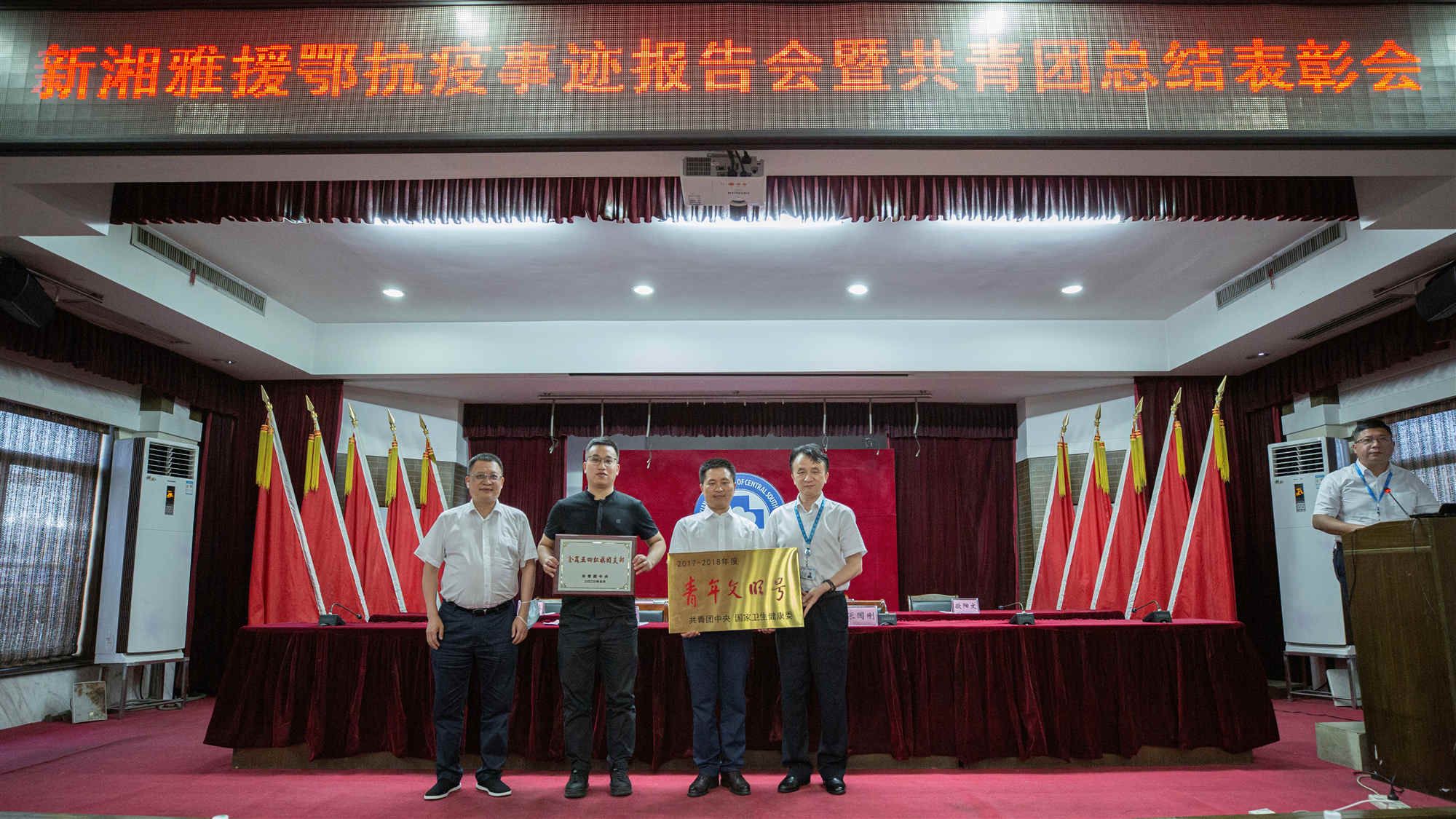 会上进行了2019-2020年度共青团系统国家级、省级荣誉颁奖仪式。本年度,医院团委获得国家级荣誉两项,省市级荣誉十余项,并获得了一系列校级荣誉和奖励。其中,放射科获评“全国青年文明号”荣誉称号,是继2006年移植中心获评后医院第二次斩获该项荣誉;第四团支部获评“全国五四红旗团支部”,是中南大学该年度唯一全国五四红旗团支部,也是医院建院三十年来首次获得该项荣誉,标志着医院基层团建工作的飞跃;泌尿外科获评“湖南省青年文明号”,程海威获评湖南省“三下乡”活动优秀个人。院党委书记何庆南和院长张国刚为获奖集体和个人代表颁奖。