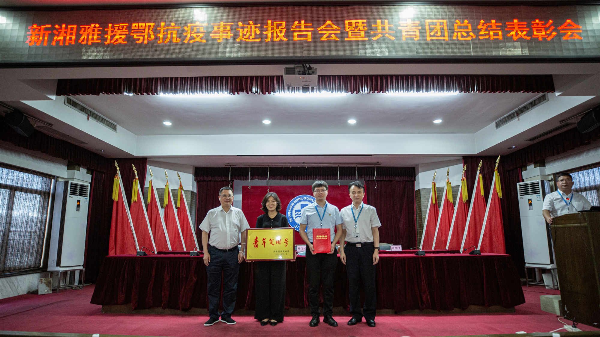 7月30日下午,中南大学湘雅三医院第十一场新湘雅青年援鄂抗疫事迹报告会暨2019-2020年度共青团工作总结表彰会在门诊楼五楼多功能厅主会场和科教楼会议室分会场同时举行。医院党委书记何庆南,院长张国刚,党委副书记、工会主席杨飞龙,党委副书记、纪委书记张劲强,党委委员、副院长朱晒红、欧阳文,党委委员、总会计师汤英,全体中层干部,全体团委委员及团支部书记及共青团系统国家级、省级荣誉获奖代表参加了会议。会议由杨飞龙主持。