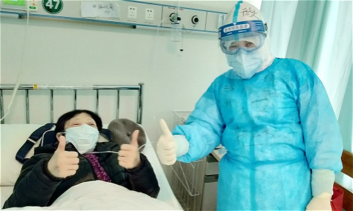 虽然离开病房工作已经有九年了,但是我来到武汉的隔离病房一点也不觉得陌生,也能很快地进入工作状态。在钟竹青老师和好搭档李守根的带领下,进行护理查房也觉得特别轻松愉快,钟竹青会从患者的心理上给予他们关心与问候,大家都觉得她特别和蔼可亲;守根虽然是男人但他绝对不缺女人的细致,对患者的病情观察特别仔细,跟他比起来我反倒感觉自己更像男人,他们身上都有值得我不断学习的东西,成为了我此次武汉支援道路上的学习榜样。今天有一位要出院的病人握着钟老师的手说到:“因为有你们,我离健康近了;因为有你们,我离家人近了;因为有你们,我离春天更近了。致敬你们这群来自湖南湘雅三院的白衣天使,正因为有了你们,我们对病魔更加有坚定的信心和态度,所以我才能这么快的好起来,我一辈子也不会忘记你们。”朴实的话语直接戳中了我们三人的泪点。
