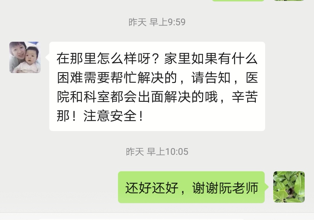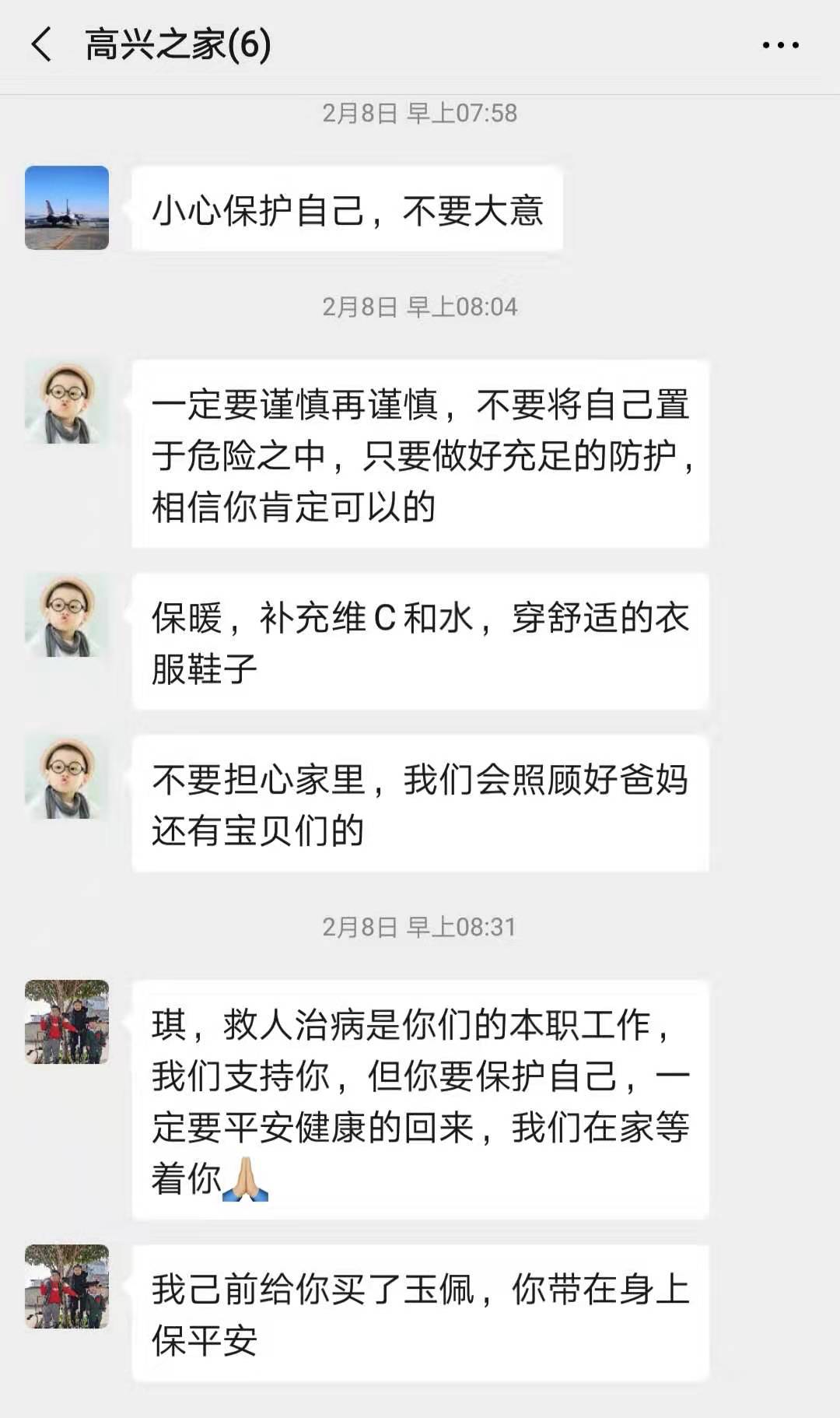 2月7日21:00,得知要去前线,当晚激动而兴奋,也有担忧。担忧的是战场上未知的考验,虽然经历了十年多临床的千锤百炼,面对过很多危重症病人和棘手的操作技能,但是这次是要离开我熟悉的科室和温馨的小家,去到一个没有孔警官罩着的“荆棘丛生”的战场。这时孔先生的一句“家里放心,我会照顾好两个崽崽,开开心心地去,我相信你……”让我顿时烦恼全消。是的,家永远是我的动力。