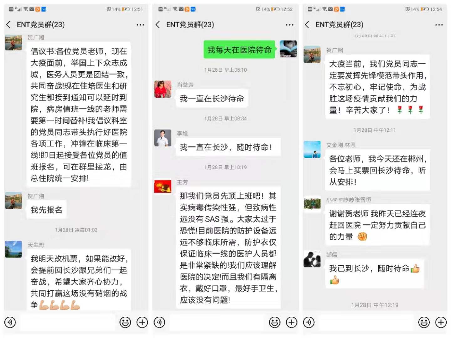 大年初三,支部书记贺广湘教授召开了一次临时的党支部会议,在严峻的抗疫形势面前,全体党员均表示愿意取消春节休假重返工作岗位。在他的号召下,科室高年资医生顶在了住院医生的前面,承担起了每天的24小时的急诊值班,在预防疫情的同时,每天还要处理多个从基层医院转院来的危重病人,并完成了数台高难度手术。护士长王芳在感冒高烧未退的情况下仍坚持在病房工作。病房值班护士张丽君、李曼鸿等为了减轻科室工作压力,主动放弃和家人团聚的机会,数天24小时坚守病房。