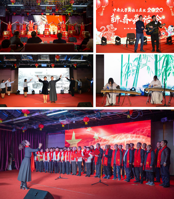院工会精心组织了丰富多彩的节目为现场观众们带来了一场视听盛宴。院工会文体协会选送,刘峰、梁湘等带来男子群舞《鼓舞潇湘》,激昂的鼓点奏响了新年的欢乐;院工会文体协会选送,丁志刚、谢卓带来双簧表演《神秘大奖》,为茶话会增添了一抹欢笑;护理教研室选送,刘子琼、胡诗苑为大家带来了一曲民乐合奏《战台风》,在悠扬的旋律中品味古风古韵;院团委、第十一党总支选送,杨梦卿、王云带领研究生们为大家献上舞台剧《风华正茂》,演出了新湘雅人青春勃发的精神风貌;离退休办选送,老同志们带来大合唱《保卫黄河》,黄河,奔流不息,新湘雅,再续芳华!