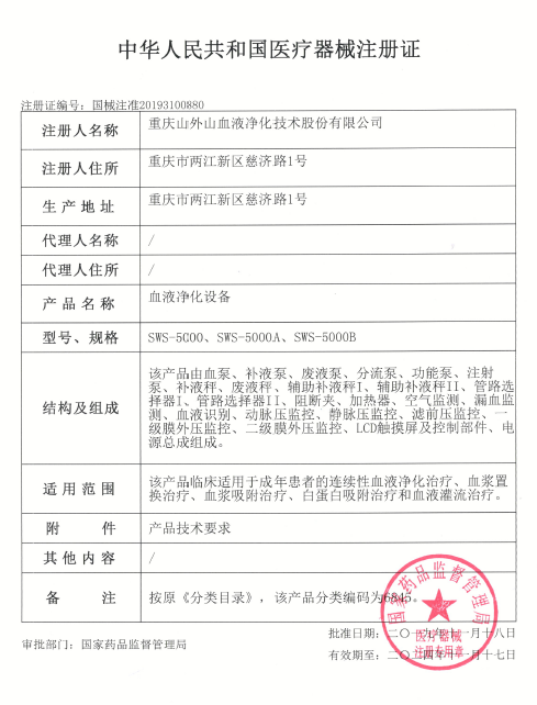2016年,重庆山外山血液净化技术股份有限公司发起了“多器官生命支持连续血液净化设备(SWS-5000)用于急性/慢性肾功能衰竭病人行连续性肾脏替代治疗(CRRT)的有效性、安全性和使用性能的前瞻性、多中心、随机对照临床试验”。湘雅三医院作为牵头单位,和首都医科大学附属北京佑安医院、天津中医药大学第二附属医院、广西医科大学第一附属医院、广西中医药大学附属瑞康医院、广州市第八人民医院等五家参与单位共同努力,历经数年克服众多困难,顺利完成了该国产血透机的临床试验。SWS-5000系列血液净化设备的上市,将打破国外同类产品对我国市场的垄断,为我国尿毒症患者的充分治疗提供有力保障。