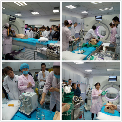 “病人出现异常,停止检查,技师老师和我进去查看病人情况!”护士和技师立即开门进去查看病人情况。当班护士判断“病人”无意识、无呼吸、无颈动脉搏动须马上进行抢救,立即呼叫当班医师。技师立即通知急诊科医师过来参与抢救。与此同时,护士建立静脉通路,推近抢救车和除颤仪,进行心电监测。医生随即赶到,和护士配合将“病人”去枕平卧、开放气道、徒手心外按压、球囊面罩给氧、静脉给药……技师在一旁记录抢救过程并和医生轮换徒手按压。“病人心率恢复,室颤心率,需立即进行电除颤!”紧接着医生和护士配合对“病人”进行电除颤。除颤结束,“病人”恢复正常窦率,给予吸氧,转运至急诊科(或病房)。至此,“病人”抢救成功,一系列配合娴熟有序。整个演练及培训持续两个小时,并取得圆满成功。