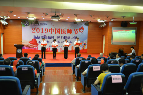 医院党委书记何庆南通过视频对三院的全体医师送来了节日的问候和祝福。他表示一年来,在三院全体医师的不懈努力下,以医疗服务为主体,人才培养、科学研究为侧翼,现代医院精细化管理为尾翼”的“一体三翼”大格局开始形成,推动着医疗、教学、科研、管理协同发展,医院核心竞争力逐步提升。他希望全体三院的医师们继续弘扬“敬佑生命、救死扶伤、甘于奉献、大爱无疆”的崇高精神,为维护人民健康贡献三院的智慧和力量。