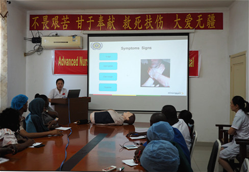 简短的开班仪式后,培训工作开始。龙护士长讲授了海姆立克急救法,学员们此前从来没有接触过这一救治法。学员们说当地有很多孩子死于窒息,这一急救法将会非常有用:“Manychildren die of choking and thistherapy is very useful.”课堂上,学员们聚精会神,在操作练习时,他们两两一组,认真学习不同人群出现窒息时的处理方法。随后,另外2位援塞护理专家张小琼、仇彩良分别讲授了无菌技术与样本采集相关知识。