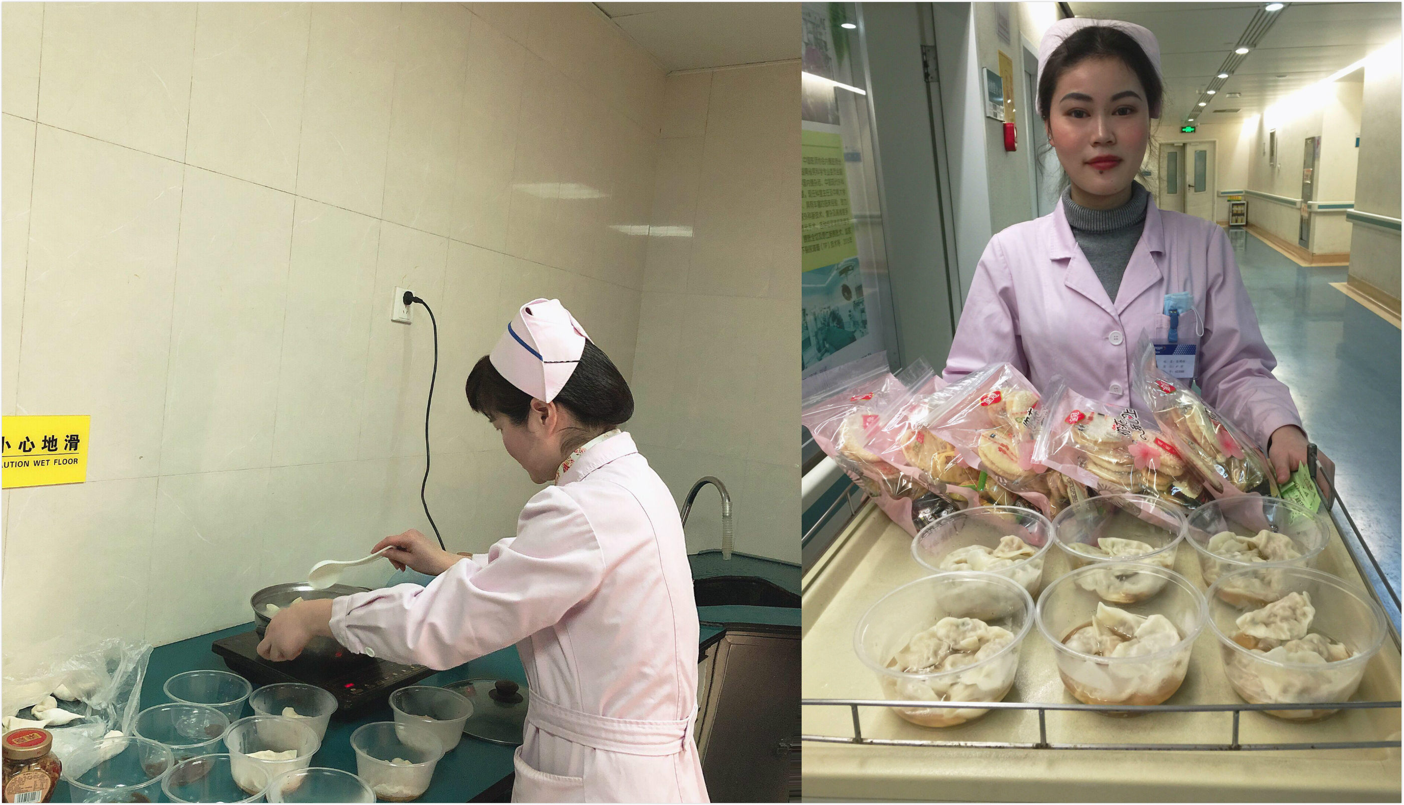 为了让患者感受到浓浓的年味,28w泌尿外科的喻月娥护士长带领着护士们精心装扮科室,在除夕之夜为住院患者送上了自己包的热腾腾饺子、零食礼包、餐票以及爱的祝福。