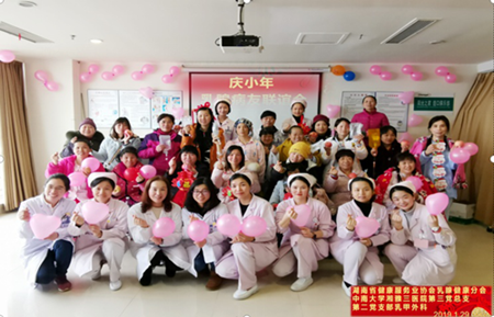 2019年1月29日下午,乳甲外科33病室成功举办了“庆小年-乳腺病友联谊会”。本次联谊会由乳甲外科王玲护士长主持,钱立元主任、科护士长吴小霞发表了新年致辞,来自本科室住院、出院、肿瘤科的病友及医务人员约60余人参加了此次联谊会。