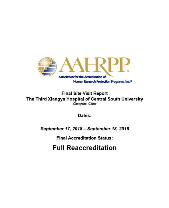 1月9日,美国人体研究保护体系认证协会(AAHRPP)总部正式公布,中南大学湘雅三医院获得了AAHRPP复核认证的最高级别 “完全认证”。