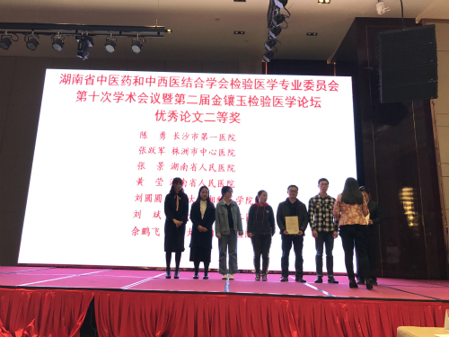 检验科佘鹏飞在优秀论文现场答辩中进行报告并荣获优秀论文二等奖。在大会同期举行的“金镶玉”检验医学论坛形态学竞赛中,检验科陈丽华、曹宇星、吴苑组成“明月星辰队”荣获团体赛三等奖,陈丽华、曹宇星获个人赛三等奖,袁金玲、吴苑获个人赛优胜奖。