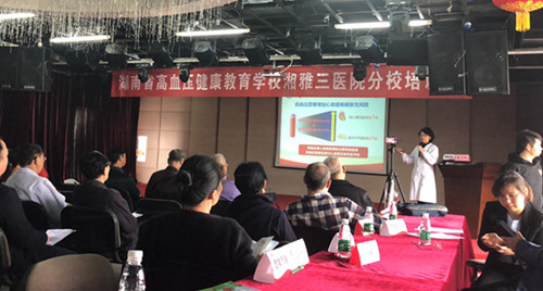 10月24日上午,中南大学湘雅三医院健康中心六楼,湖南省高血压健康教育学校校长、湘雅三医院袁洪教授和心内科主任蒋卫红教授正在给几十名省直机关离退休的老同志讲一堂高血压知识防治的科普课。