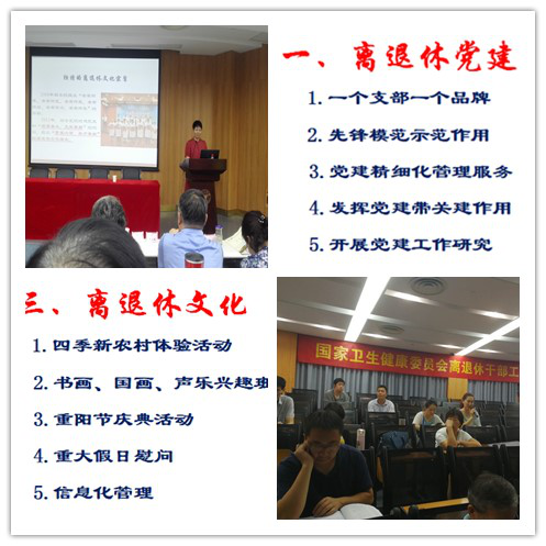 会议组织学习了新时期老干部工作精神、人口老龄化现状及应对措施、中老年人心理健康与心理调适、中老年人生殖健康问题及对策、新媒体时代的信息传播与舆情应对、新科技革命与医院定位发展模式,提出了离退休工作精准化、信息化服务的新理念,强调离退休干部工作就是党建工作,要求做好离退休干部的思想建设、政治建设、党组织建设。