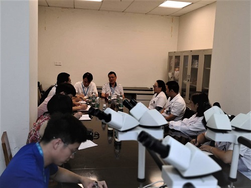 院领导一行首先参观了病理科各项工作流程并听取了工作介绍。汇报会上,谷永红主任详细汇报了病理科目前的工作状况,并提出设施场地、仪器及人员配置等困难影响病理科建设,制约了病理科发展。粟占三教授及技术室负责人彭长缨、杨军副教授等人也对科室现有问题提出了各自的看法。