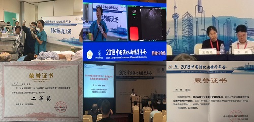在本次大会中,王晓艳主任受邀进行内镜演示,就一例胰尾部肿块患者进行标准扫查及超声内镜引导下穿刺,术中王晓艳主任与现场专家们进行互动交流,详细讲解并演示胰腺扫查标准手法,同时应用超声内镜弹性成像及超声造影对病灶进行联合诊断,最终通过超声内镜穿刺,仅用一针经现场病理确诊为肿瘤,其精彩的操作、专业的讲解,赢得与会专家们的掌声。同时王晓艳主任还在“超声内镜学组”及“小肠疾病学组”的学术讲座中担任主持。消化内科内镜团队的青年骨干也积极参加本次学术盛会交流,田力主治医师的“超声内镜引导下胆囊造瘘行胆囊息肉切除术“的内镜视频,在全国100多个优秀内镜作品中脱颖而出进入决赛,经过现场专家及大众评委的严格评审,最终获得“全国内镜视频大赛决赛二等奖”。消化内科超声内镜团队在王晓艳主任带领下,其创新性工作也应邀进行大会发言,得到专家们的一致好评。此次大会中,消化内科共有4篇内镜壁报入围,田力主治医师的《超声内镜引导下细针穿刺抽吸术(EUS-FNA)对胰腺神经内分泌肿瘤的诊疗价值》从全国232篇壁报中突围获得“优秀壁报奖“,也是湖南省消化领域展示成果及获得奖励最多的单位。