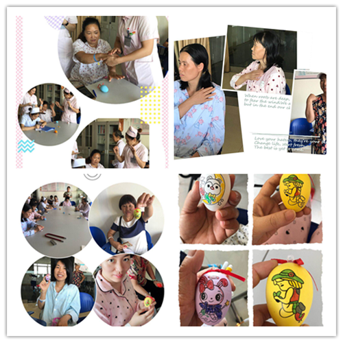 健康知识讲座结束后,王玲护士长对术后因缺乏运动引起患肢轻微淋巴水肿的病友进行一对一指导,并运用手法治疗,促进上肢淋巴液的回纳。课后还带领病友们进行了患肢功能康复训练及彩蛋描绘,指导乳腺病友循序渐进的进行功能锻炼,在运动中达到减轻上肢淋巴水肿的目的,并体会到活动的乐趣。
