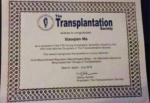 为表彰优秀的青年科研工作者,大会特设立青年研究者科学奖,全球共计24名青年研究者得奖,其中有4名中国代表。王维教授团队的马小倩副教授凭借“CORD BLOOD DERIVED REGULATORY MACROPHAGES (MREG) –AN ALTERNATIVE SOURCE FOR MREG-BASED CELL THERAPY IN TRANSPLANTATION” 的精彩演讲获奖,为此次湘雅三医院在国际移植年会的风采展示画上了完美的句号。这次大会的丰硕成果也标志着王维教授团队在异种胰岛移植治疗糖尿病及相关免疫调节技术方面取得的重大突破得到了移植领域国际主流的认可,未来将为我国甚至世界糖尿病患者带来更多的惊喜!