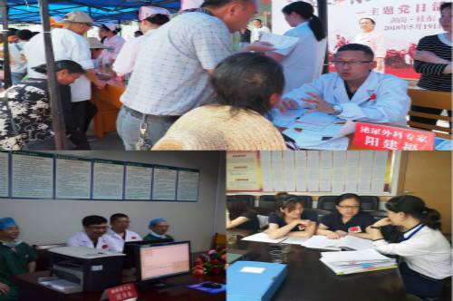 启动仪式结束后,全体援外医疗专家开展义诊、教学查房、病例讨论、专科指导等形式多样且内容丰富的基层医疗服务活动。这次活动,对于正在准备创建二甲的桂东县人民医院来说,可以说是及时雨。为此,桂东县人民医院安排了对口临床科室医护人员“认领”专家环节,甚至把积压多年的病历拿出来请教……记得还在参观第一军规广场时,陪同的桂东县人民医院副院长就一个劲的打听谁是阳教授,原来是有几个泌尿外科疑难病例需要请教;龙燕琼护士长应桂东县医院护理部主任邓易争的要求,对于护理管理、护士培训及门急诊工作进行指导;侯长征医生则在麻醉科主任的陪同下查看了科室二甲评审资料准备情况并提出建议。