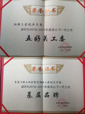 4月26日,中南大学在校本部升华楼101报告厅召开“中南大学关工委2016-2017年度工作总结表彰暨2018年工作部署会议”。湘雅三医院荣获2016-2017年度“五好关工委”、“基层关工委工作品牌”荣誉称号,受到大会表彰。校党委常务副书记、校关工委主任陶立坚出席,离退休工作处党委书记、校关工委秘书长姬志洲主持会议。