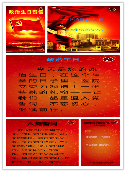 2016年开始,湘雅三医院党委要求全院党员(含离退休党员)都要过政治生日。在政治生日当天,即支部大会接受其为预备党员之日(经上级党委批准后),党支部发出政治生日贺卡,提醒党员牢记身份和责任,增强党员的归属感。