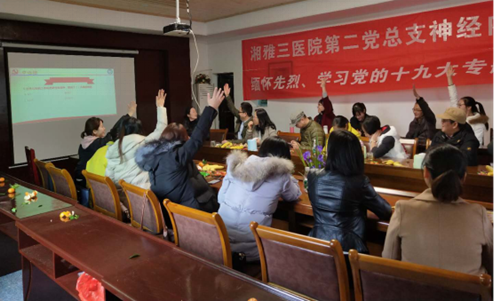 宋治同志为大家讲授党课,深入浅出的解读了十九大的会议主要精神。支部成员以抢答赛的方式再次学习十九大精神,深刻领会习近平新时代中国特色社会主义思想,营造了积极学习党的十九大精神的浓厚氛围。宋治同志表示,通过此次红色之旅学习活动,全体党员要进一步提高认识,要在整个支部乃至整个科室中掀起学习的热潮,不断提高思想素质和业务技能,在实践中提高自己,把个人价值与医院发展融合起来,并要求神经内科全党员联系实际,立足岗位,在实干中学,促进学科发展。实现自身的人生价值。