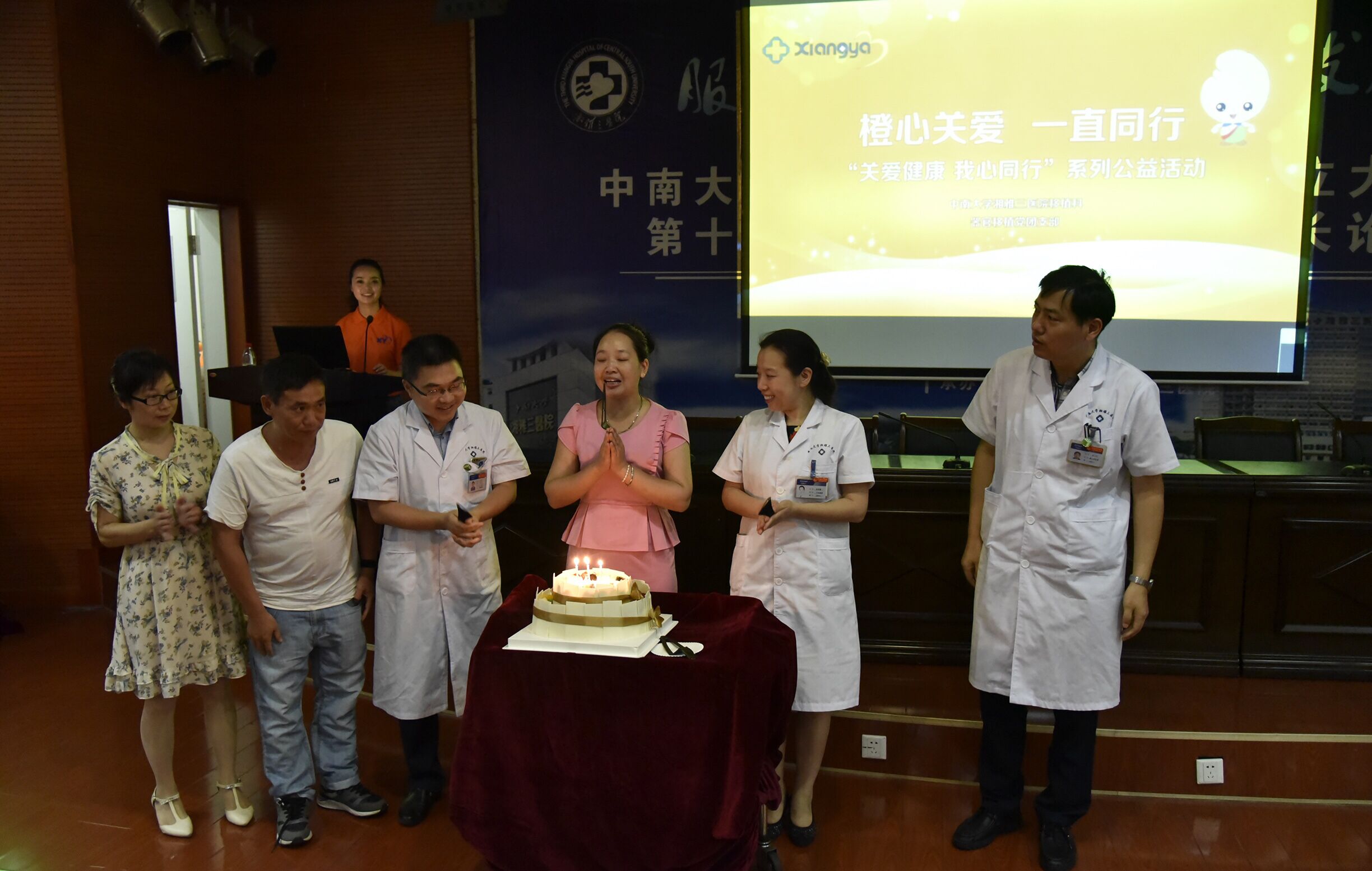 会场外以展示了许多移植患者当年移植后抱着移植吉祥物“湘肾侠”走出移植中心重获新生的照片。病人看到照片后感动不已,他们说:“在七夕这个幸福的日子,带着生命中最贵重的礼物,回到‘娘家’与兄弟姐妹相聚在一起,重温幸福时刻,感到非常的温馨和快乐”。大家纷纷表示希望每年都能在此相聚。整个会场在“生日快乐”歌声中结束活动,有几位病友正是在近几年的8月28日完成移植手术,大家一起为他们庆祝这个特殊的获得新生的“生日”。