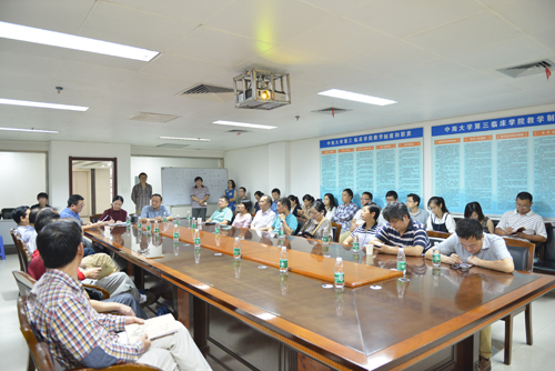 余枭主任汇报了我院在教学改革、临床技能大赛、大学生创新创业等方面所取得的一些成绩。我院八年制主动见习融通教学改革、全国执业医师分阶段考试试点组织工作都得到学校和省卫生计生委领导的认可和高度评价。特别是由我院代表中南大学在第八届全国大学生临床技能竞赛中以第一名的成绩取得特等奖,我校也因此成为全国唯一一家在该赛事获得5个特等奖的高校。上述成绩的取得离不开医院领导对本科教学工作的高度重视,离不开教学督导专家的悉心指导和无私奉献,离不开各教研室、临床科室的大力支持和全体老师辛勤付出。