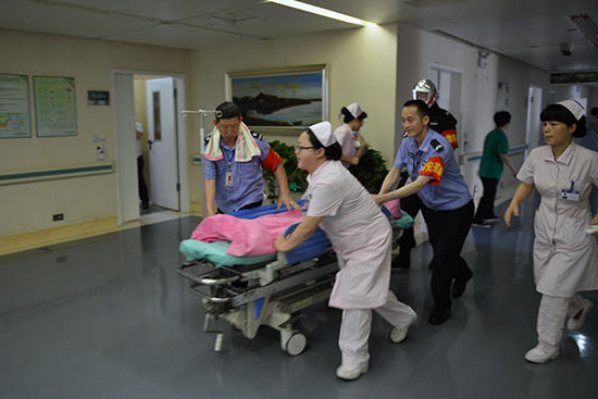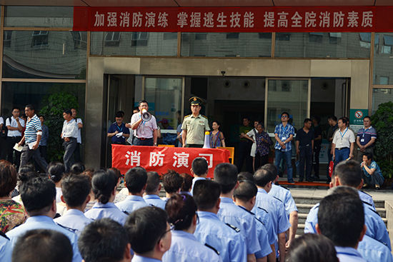在演习中,外科大楼7楼阳台东南角外坪和16病室医生办公室北面突发火灾。医院消防控制中心接到火警,迅速组织应急消防队及救援人员赶到火警现场,并立即向119报警。外科楼警铃响起,照明灯熄灭应急灯闪烁,医院义务消防员与医务工作者一起疏散病人,急救人员现场救治受伤人员。5分钟后,10余台消防车赶到医院,掌握火情后,消防官兵立刻冲进“火场”,启动高压水枪进行灭火,并采用云梯车现场灭火,对高楼被困的人员实施救援。经过近三十分钟奋战,“大火”终于被扑灭,所有住院患者和医护人员全部疏散到安全地带,消防实战演习取得圆满成功。