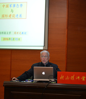 周教授今年80岁,身体硬朗,精神饱满,声音洪亮,思维敏捷。讲座开始,他以《中国的和平发展》白皮书为蓝本,明确界定我国的核心利益,详细分析了我国周边复杂、严峻的军事形势,指出朝鲜半岛核危机、中印边界争端和海洋安全问题是我国周边军事的热点,他认为这些危机、争端和安全问题对我国的核心利益构成严重威胁,针对这些危机、争端和安全问题,周教授谈到了我国政府及时采取相应措施,要求大家增强国防安全的忧患意识。