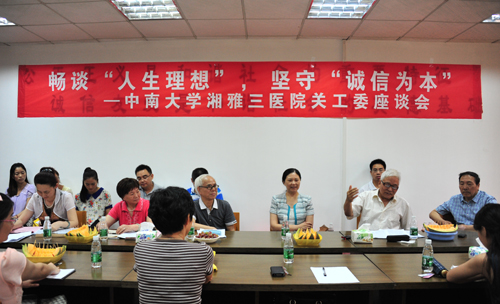 6月27日下午,湘雅三医院关工委在离退休活动中心会议室召开了“畅谈人生理想,坚守诚信为本”主题座谈会。中南大学湘雅医学院关工委副主任刘耀光,湘雅三医院党委书记、关工委主任罗爱静,湘雅三医院离退休老领导、党建组织员杨伯勋、刘浔阳,原关工委主任郑兰香出席会议并讲话。离退休办姜永兰、能源动力中心周勇、团委李姗、关工委秘书杨建叔等部分关工委委员以及2013年新进人员代表等参加了会议。会议由湘雅三医院关工委副秘书长彭艳主持。