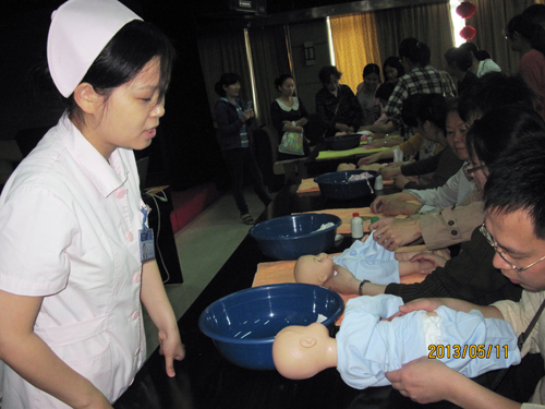 活动发起人、妇儿小组组长、产科护士长向亚利开场致辞,并对此次活动的过程做了一个简单的介绍。随后,新生儿科护士长谭彦娟,康复科邓丽明老师介绍了产儿科、康复科的特色。在活动中,向亚利护士长和袁青护师耐心地为大家示教了新生儿沐浴、更衣、皮肤护理、脐部护理等婴儿护理常识。孕产妇及家属们饶有兴趣地实习了婴儿护理操作并进行了比赛。所有参加活动的人均感慨做母亲的艰辛和不易。为了感谢准妈妈在孕期的辛勤付出,准爸爸们当场宣誓要努力做个好爸爸,并向在场的所有母亲们献花。活动在轻松愉快的气氛中画上了圆满句号。