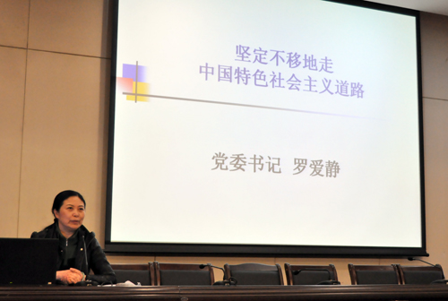 党委书记罗爱静以《坚定不移地走中国特色社会主义道路》为题,为大家解读了“中国梦”的实现之路,她引用习近平的话说“中国特色社会主义,是科学社会主义理论逻辑和中国社会发展历史逻辑的辩证统一,是根植于中国、大地、反映中国人民意愿、适应中国和时代发展进步要求的科学社会主义,是全面建成小康社会、加快推进社会主义现代化、实现中华民族伟大复兴的必由之路。”