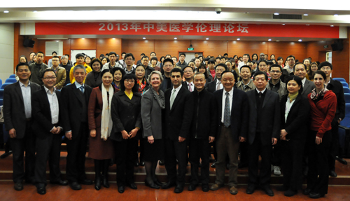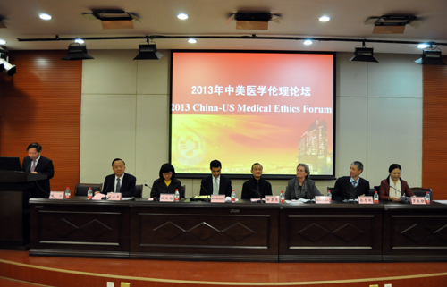 3月21日,由中南大学湘雅医学院、湘雅三医院和美国雅礼协会共同主办的“2013年中美医学伦理论坛”在湘雅三医院顺利召开。美国耶鲁大学公共卫生学院Kaveh Khoshnood副教授,耶鲁大学医学院Madelon Baranoski副教授,中南大学副校长田勇泉,湖南省食品药品监督管理局药品注册处处长姚咏梅,中南大学外事处处长余志明,湘雅三医院院领导罗爱静、陈方平、袁洪在主席台就坐。