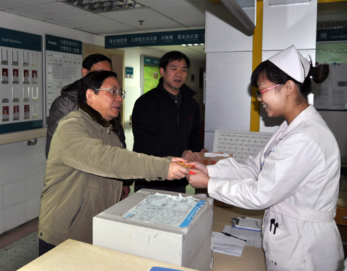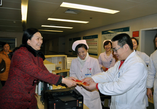 2月10日,农历大年初一一大早,院领导罗爱静、袁洪、朱晒红、叶启发、范自力,与相关职能部门负责人,亲切慰问春节期间值班的职工,并探望部分住院病人,向他们送上新春的祝福和问候。院领导一行先后到外科病房、内科病房、急诊、后勤等部门慰问。每到一处,都与值班职工亲切握手、交谈,对他们无私奉献、勤奋敬业、患者至上的精神表示赞许。同时还到病房看望部分住院患者,并祝福他们早日康复。