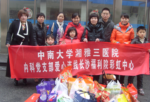 1月25日上午九点,湘雅三医院内科党支部的青年志愿者们开着自己的车载着大堆的食品、衣物,带着慰问金向目的地——长沙市第一福利院前进。