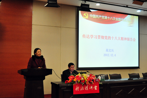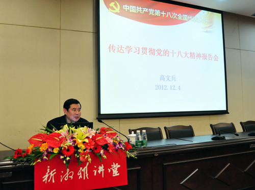 12月4日晚,湘雅三医院新湘雅讲堂在外科楼国际学术报告厅举行,中南大学党委书记高文兵传达了十八大精神,讲述了作为列席代表参加党的十八大的感受,介绍了大会盛况和大会主要精神,并就如何学习宣传贯彻党的十八大精神的提出指导性意见,要求湘雅三医院全体党员职工同志学习好、宣传好、贯彻好党的十八大精神。