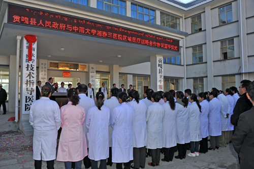 9月26日,中南大学湘雅三医院与西藏自治区贡嘎县人民政府对口支援协议签订仪式在贡嘎县卫生服务中心举行。湘雅三医院院长陈方平与西藏自治区山南地区行署副秘书长张维为“中南大学湘雅三医院技术指导医院”揭牌,副院长朱晒红与贡嘎县人民政府副县长其米拉珍签署医疗帮扶战略协议。山南地区卫生局局长巴桑、贡嘎县县委书记夏文斌、常务副书记李贤荣、副县长潘旺明等领导出席签约仪式。