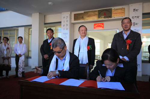 图为副院长朱晒红与贡嘎县人民政府副县长其米拉珍签署医疗帮扶战略协议。