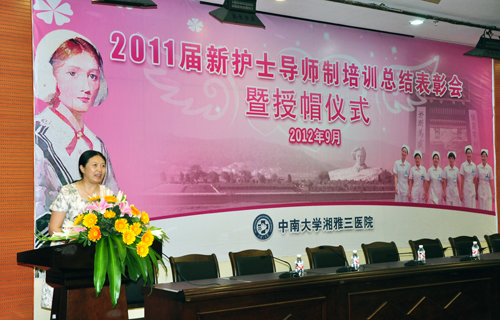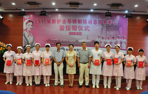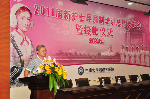 副院长朱晒红教授宣读了湘雅三医院关于表彰“2011届优秀新护士及优秀新护士导师”的决定,他对护理部采用多元化客观指标的层级评优考核方案表示高度肯定,并强调大家要以感恩的心好好工作和生活。他要求全院护士进一步统一认识,以创建国家优质医院为目标,团结一心,为三甲复审和争创国家临床护理重点专科而努力。