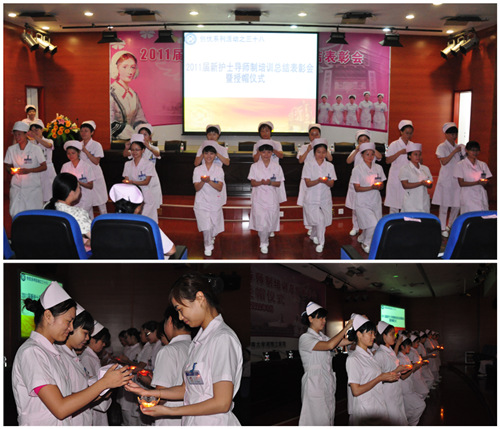 在授帽仪式前,《感恩的心》耳畔响起,2011届新护士在ICU护士谢丽纯的带领下,进行了“感恩的心”手语表演,他们身上散发着青春与优雅,用心灵演绎了感恩手语的精髓,完美展示了年轻护士的风采,感染了每一位在座的护士同仁,许多与会者为之感染潸然泪下。随后,2011届47名新护士在护理学创始人南丁格尔像前,伴随着“平安夜”的庄严乐曲,导师为新护士戴上圣洁的燕尾帽,接过自己导师手中的蜡烛,站在南丁格尔像前宣读誓言。