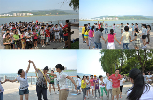 接下来的“团队友谊赛”可谓丰富多彩。比赛共设置了“穿越呼啦圈”,“你来比划我来猜”,“十人九足”三个游戏环节,全体新进人员被分为6个组展开竞赛。“穿越呼啦圈”考验的是团队身体协作能力,大家手牵手逐个从呼啦圈中穿过,碰到困难也是紧紧地牵着身边队员的手,不因某位队员的耽误而责怪,反而给予更多的鼓励。一位“准妈妈”队员也积极参与到了游戏之中,轮到她时,队员们纷纷提醒她“慢一点,注意安全”。