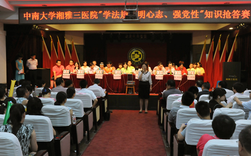 6月21日晚,湘雅三医院在门诊楼多功能会议厅举行“学法规,明心志,强党性”知识抢答赛,为建党91周年献礼。中南大学党委常委组织部部长韩清波、校办公室主任高山,宣传部长刘建华、研工部部长白毅、统战部部长龙大为,医院领导罗爱静、吴希林、黄进华、黄飞舟、邓云龙、范自力等出席并担任现场仲裁,来自医院的8支党支部代表队参加了比赛。