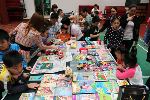 6月1日下午,小朋友和家长早早来到综合楼一楼中厅的活动场地,为的是占到一个好摊位。小老板们将自己愿意出售和交换的各类文化艺术物品(书籍、文具、玩具、儿童用品等)或自制的各种小作品(如:书画作品、手工制作等)标上价格,在跳蚤市场上摆摊公开出卖或交换。小朋友们可认真了!好几天前就将要出售或交换的物品清理出来,列出清单,标好价格。家长们也积极支持与配合,给出一个极具诱惑性的政策:卖出东西的钱由小朋友自己支配。
