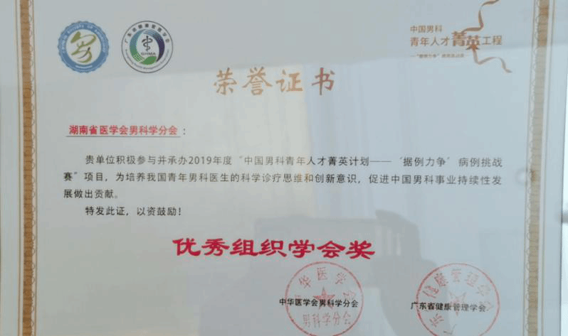 湘雅三医院泌尿外科是湖南省医学会男科学主委单位,何乐业教授担任湖南省男科学专业委员会主任委员期间,年会论文投稿数逐年提升,积极推动医院及我省男科学事业的发展,在2019年度“中国男科青年计划——‘据例力争’病例挑战赛”项目中荣获“优秀组织学会奖”,得到湖南省医学会及上级学会的高度赞赏。